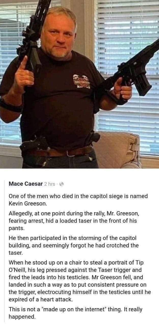 전 하원의장의 초상화를 떼려고 올라갔다가 테이저건이 발사되어 고환에 맞음.
